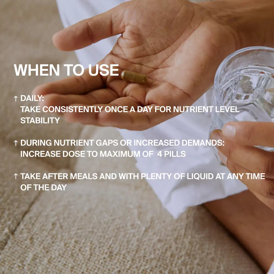 Wir empfehlen eine Dosierung von 2 Kapseln pro Tag. So deckt diese Packung den Bedarf an Mikronährstoffen für zwei Monate ab. Bei unausgewogener Ernährung empfehlen wir 4 Kapseln pro Tag.