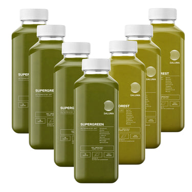 Das 7-Tage-Set enthält 4× Supergreen und 3× Run, Forest– perfekt abgestimmt für deine tägliche Routine. Nachhaltig verpackt in bio-kompostierbaren Flaschen, ist das Daily Green Juice Package der einfache Weg zu mehr Energie