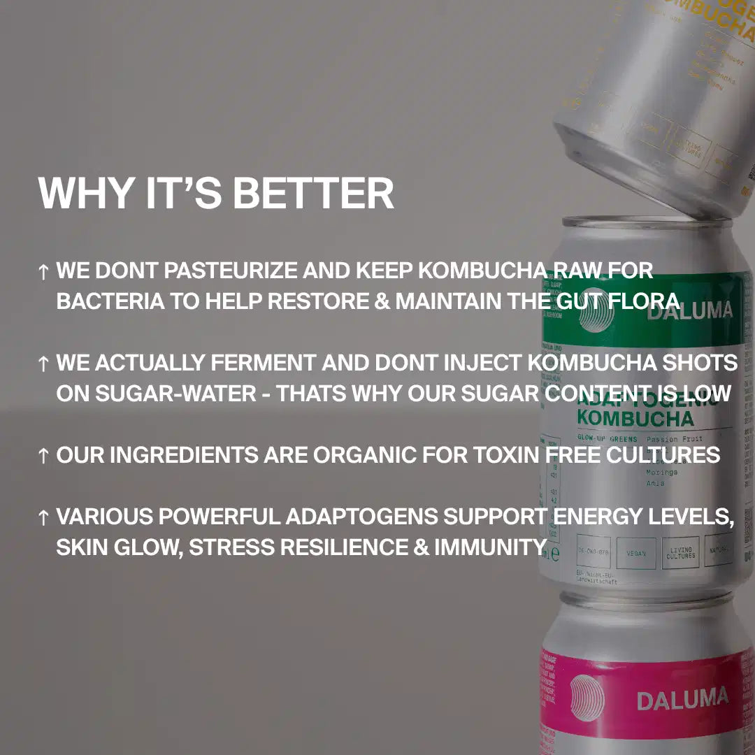 Die Kombination aus funktionellen Adaptogenen und Pilzen wie Lion’s Mane, Reishi und Chaga unterstützt Fokus, Gedächtnis und mentale Widerstandskraft. Der Kombucha ist bio, roh und unpasteurisiert, wodurch alle wertvollen Enzyme und Kulturen erhalten bleiben.