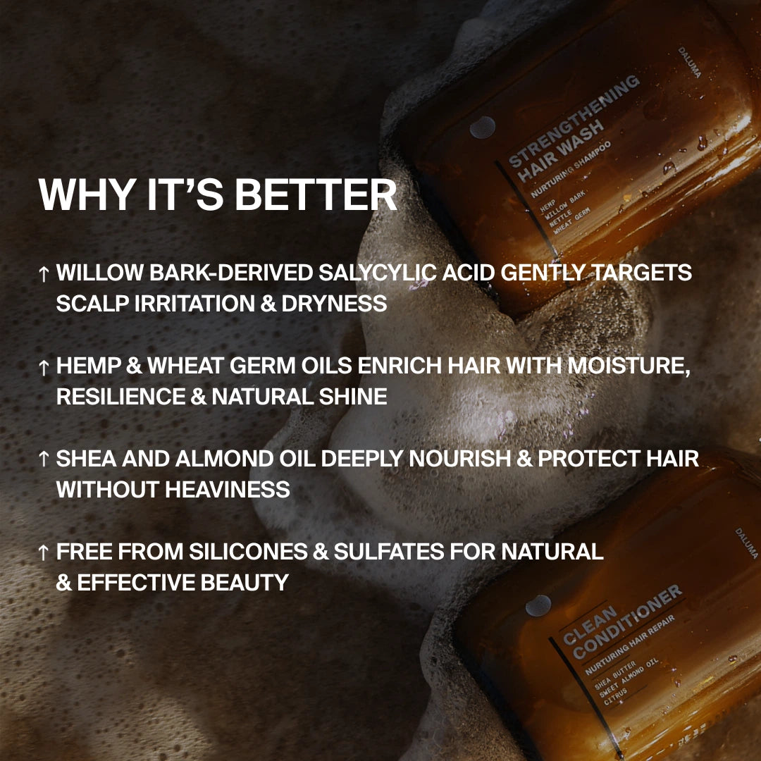 Das Hair Care Duo vereint sanfte Reinigung und intensive Pflege, um Haarwachstum, Feuchtigkeit und Glanz zu fördern. Das Strengthening Hair Wash befreit die Kopfhaut von Ablagerungen, beruhigt mit Salicylsäure und stärkt die Haarstruktur. Der Clean Conditioner spendet Feuchtigkeit, glättet die Haaroberfläche und sorgt für geschmeidiges, glänzendes Haar.
