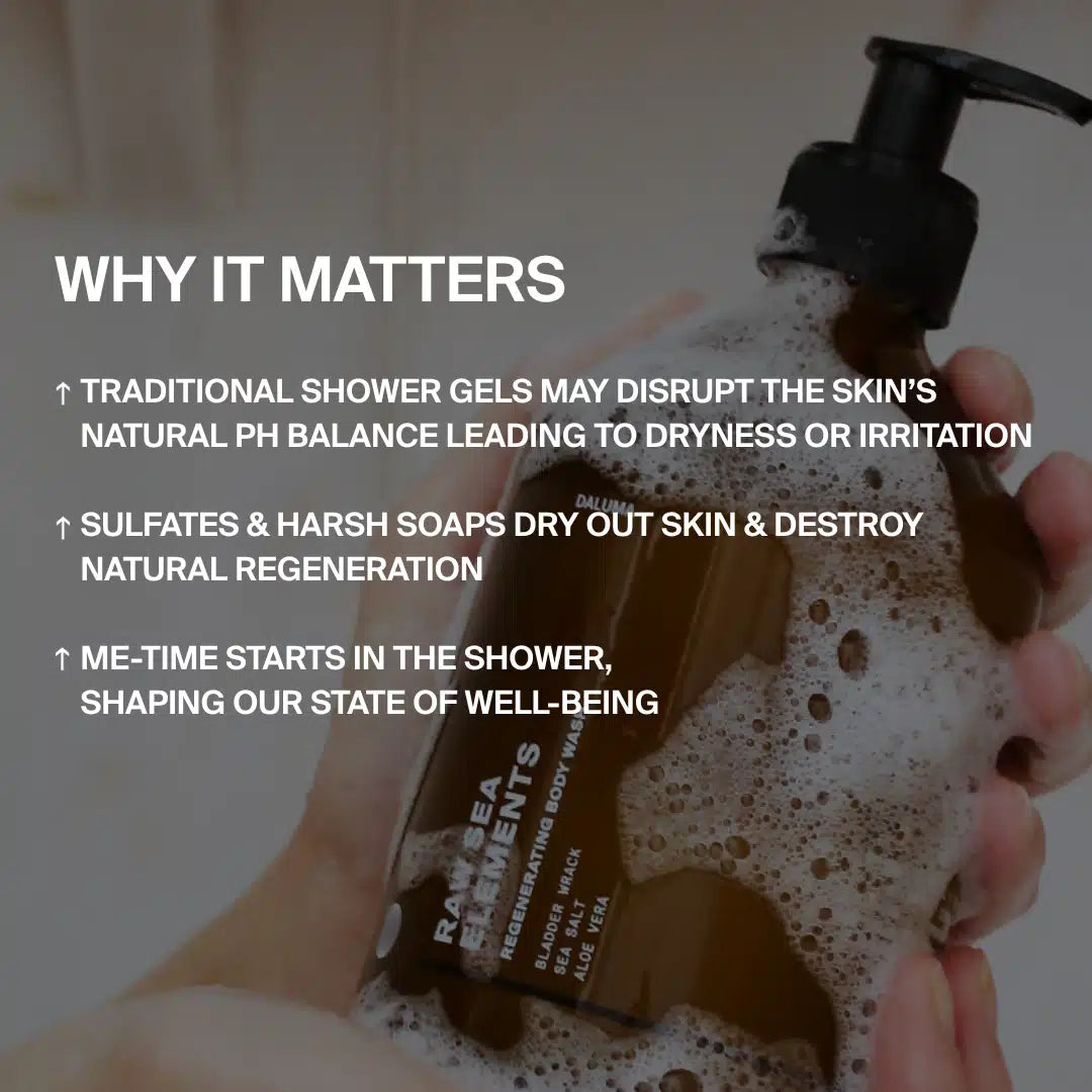 Blasentang unterstützt die Kollagensynthese und fördert die natürliche Erneuerung der Haut, während Aloe Veralanganhaltend Feuchtigkeit spendet und Spannungsgefühle mildert. Das Duschgel ist ohne Silikone und Parabene und damit perfekt für alle, die auf bewusste, saubere Pflege setzen.