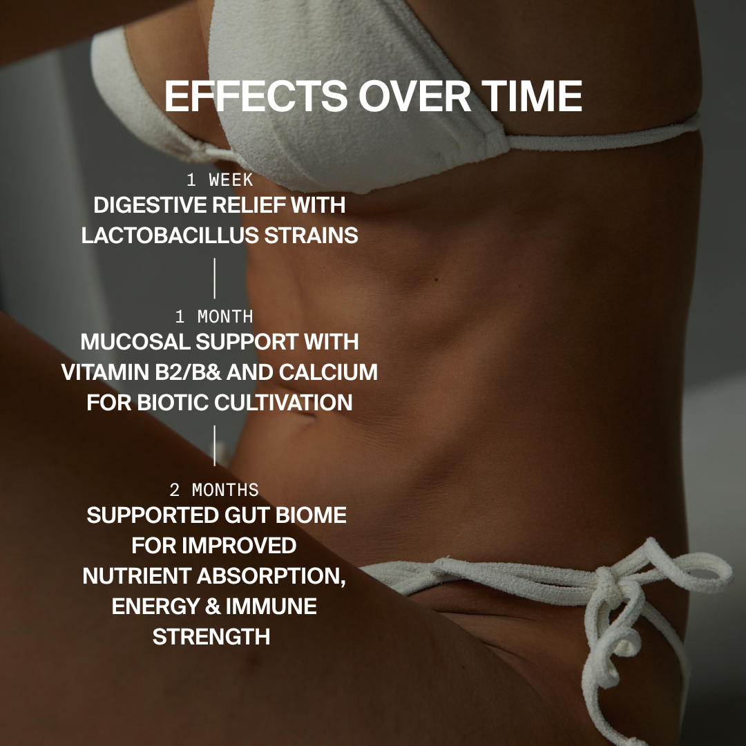 Rotalgen ((Lithothamnium calcareum) 30% Calcium), Akazienfaser Pulver, Mischung (22 Stämme, 100B CFU/g; Mischung Lactobacillus Bakterienkulturen folgender Variationen: (acidophlus, crispatus, casei, paracasei, rhamnosus, reuteri, heleveticus, fermentum, salivarius, bulgaricus, gasseri, plantarum, brevis, lactis, Johnsonii); Mischung Bifidobacteria Bakterienkulturen folgender Variationen: (lactis, breve, longum, bifidum, infantis, Animalis); Stretococcus thermophilus), Überzugsmittel: GAR Caps; lebende bakterienkulturen-Mischung (Saccharomyces Boulardii, 20B CFU/g), Pyridoxal-5-Phosphat, Riboflavin-5-Phosphat-Natrium.
