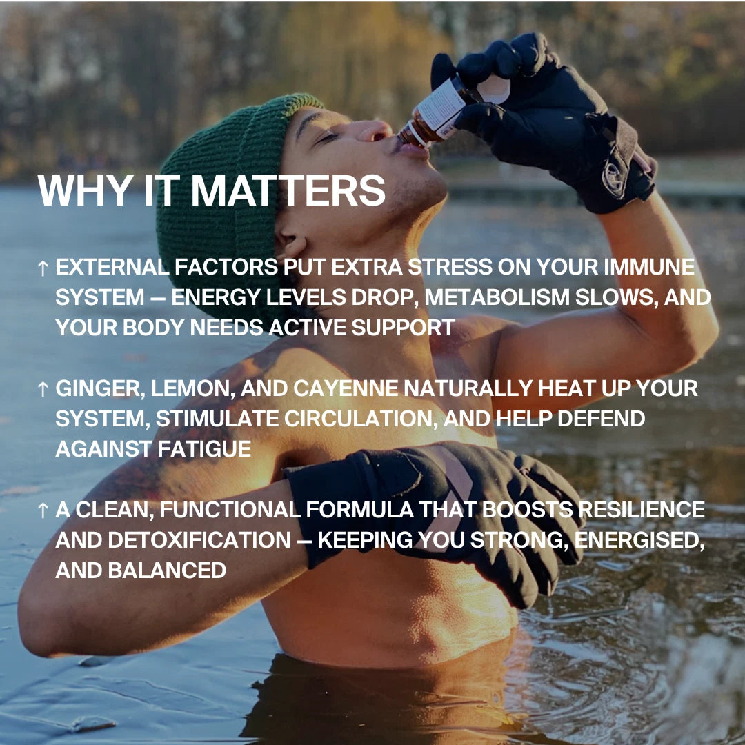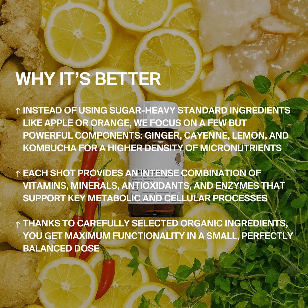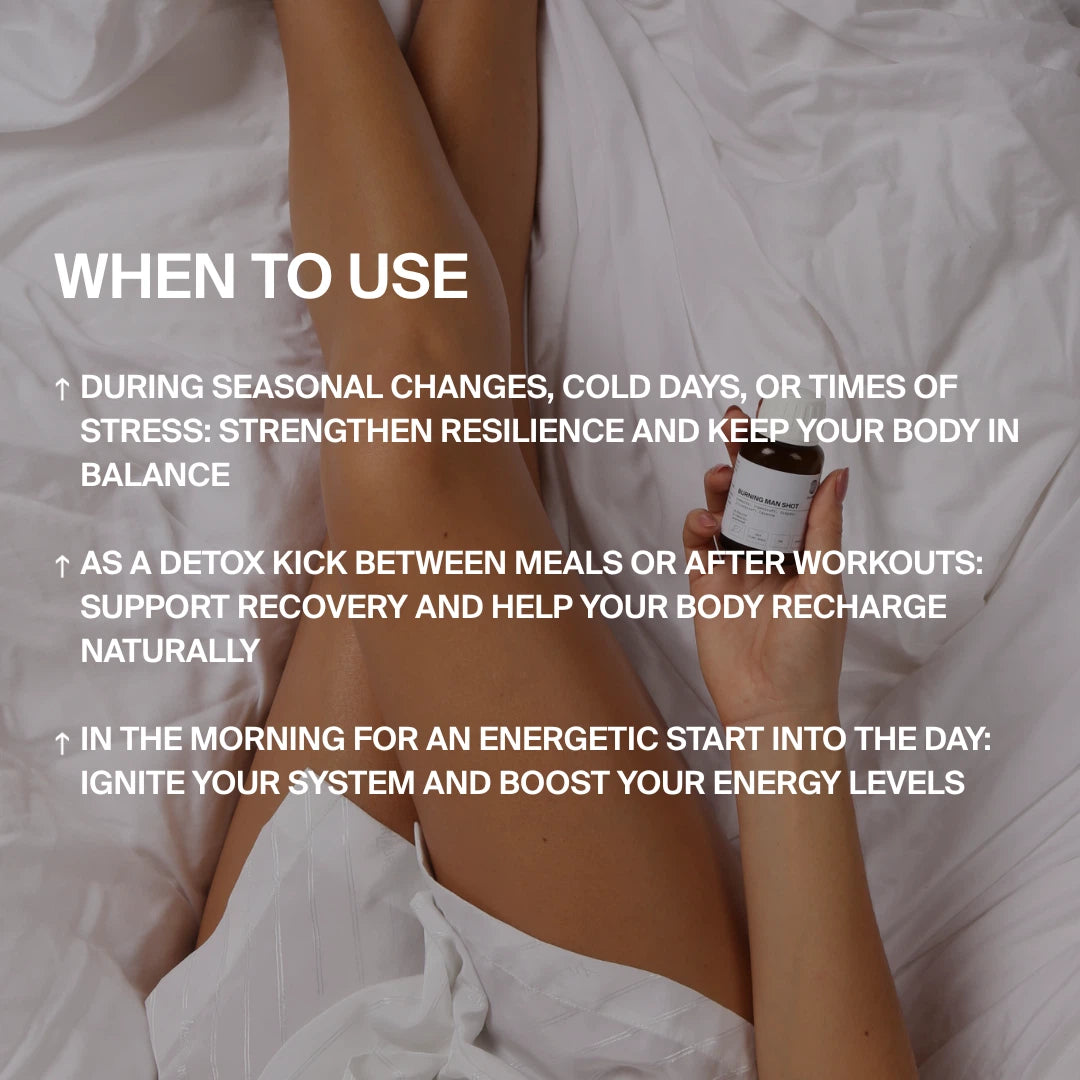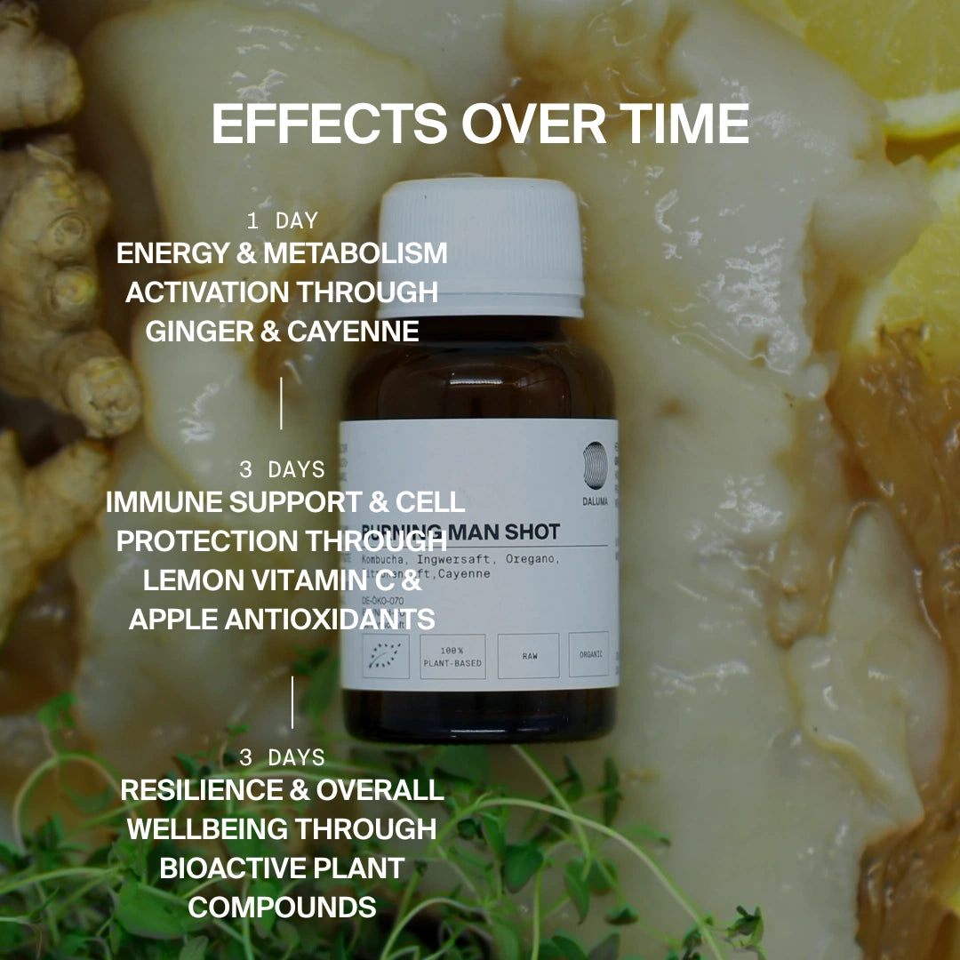 Der Burning Man Shot im 12er Pack kombiniert die Schärfe von Ingwer und Cayenne mit der Frische von Zitrone. So wird dein Immunsystem gestärkt, während gleichzeitig Stoffwechsel und Verdauung aktiviert werden.
