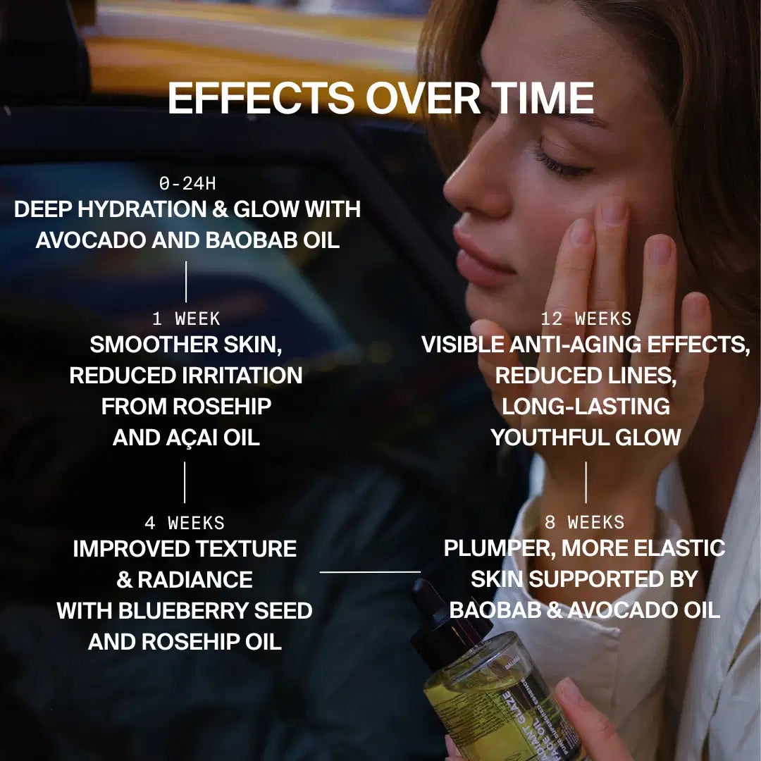 Die Mischung aus Avocadoöl, Hagebuttenöl und Rosmarinöl wirkt regenerierend, antioxidativ und schützend. Während Avocadoöl die Haut intensiv nährt, unterstützt Hagebuttenöl die Zellerneuerung und verbessert das Hautbild. Rosmarinöl fördert die Durchblutung, glättet feine Linien und schenkt einen sichtbaren Glow Booster-Effekt.