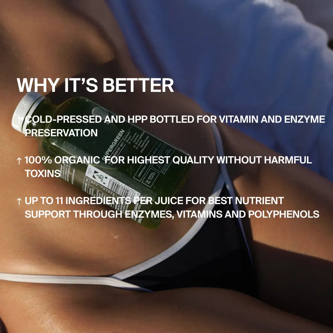Der Green Juice Supergreen ist ein intensiver bio-kaltgepresster Gemüsesaft, der natürliche Frische und volle Pflanzenkraft liefert. Reich an Chlorophyll und Bitterstoffen – als Teil einer bewussten, pflanzenbasierten Routine konzipiert.