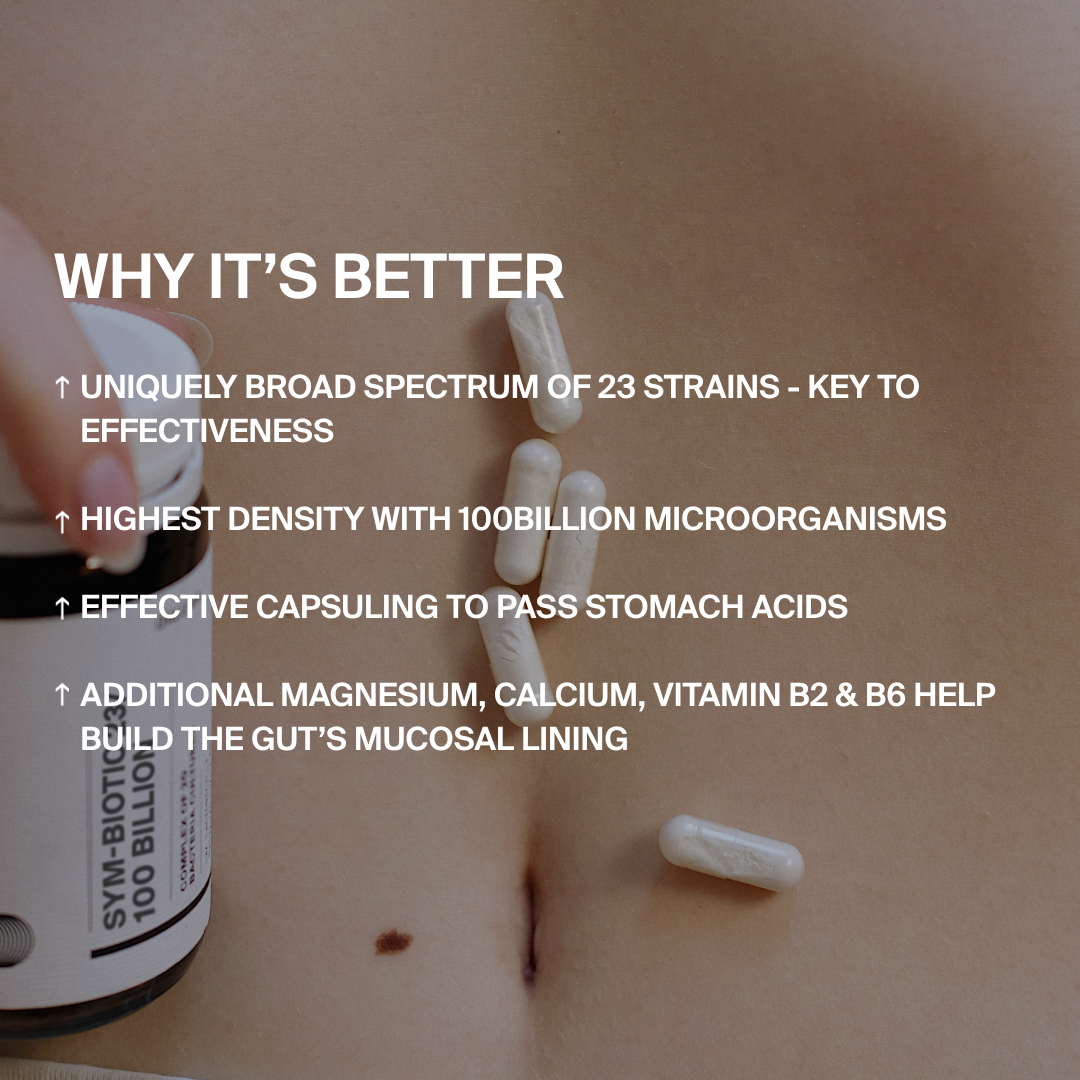 Die Sym-Biotic 23 / 100 Milliarden Darmbakterien-Kapseln kombinieren 23 ausgewählte Kulturen mit 100 Milliarden KBE* pro Tagesportion – entwickelt als praktische Ergänzung für deine tägliche Routine.